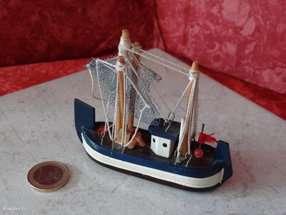 Un bateau miniature, c'est une petite maquette d'occasion, faite à la main. Elle représente un chahutier et elle est en bon état.