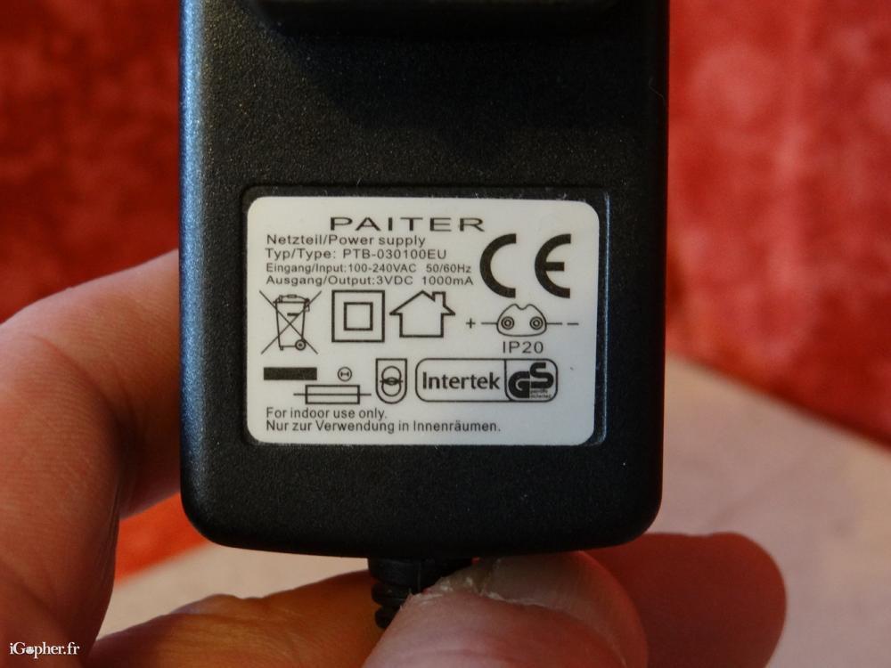 Puissance : 100-240volt 50/60Hz. Output 3volt 1000mA. Prise IP20.