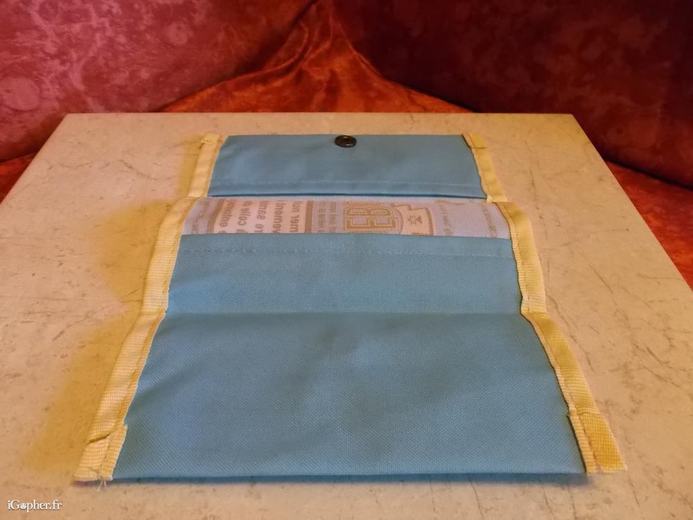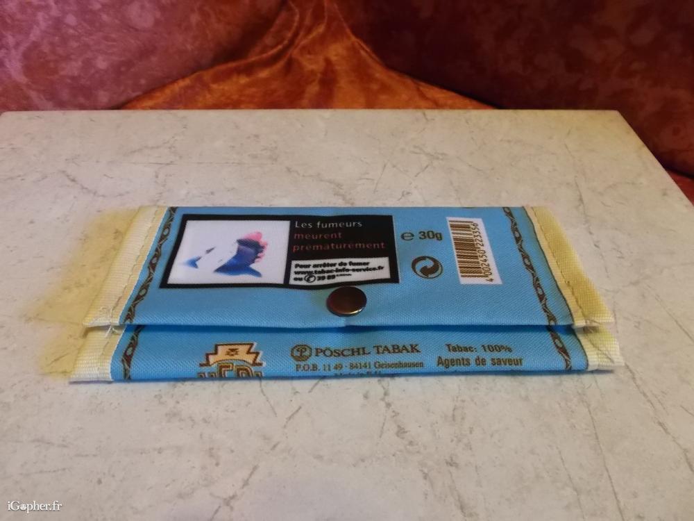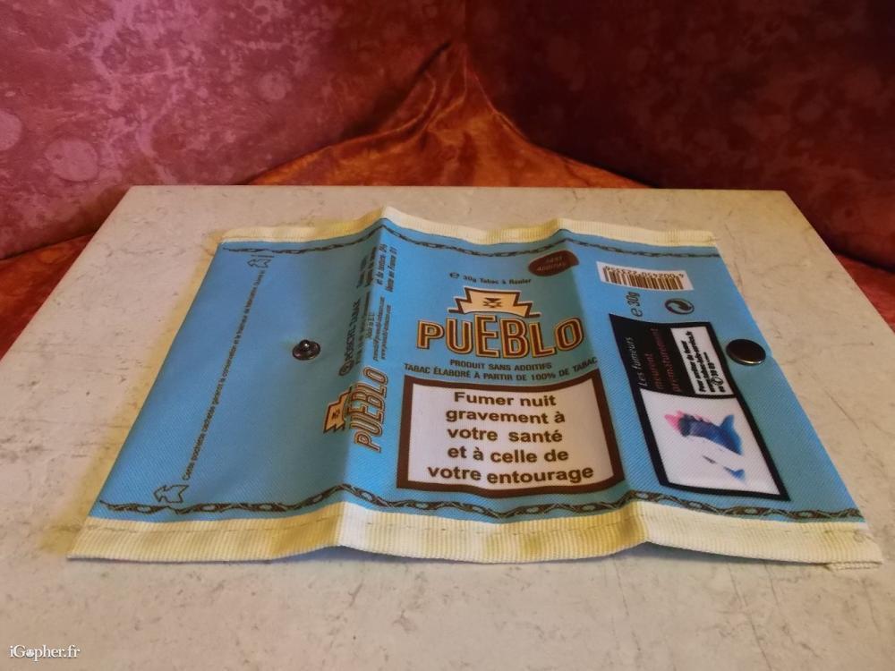 Une blague à tabac Pueblo, elle est neuve, c'est une pochette. Elle est en textile, c'est du lin. Elle dispose d'une fermeture par bouton pression.