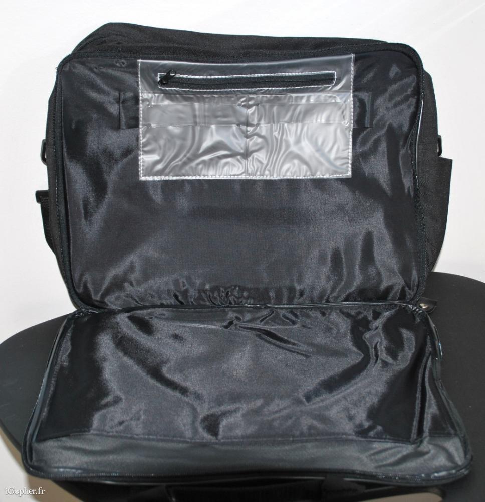 Sur le devant, il y a une grande poche fermée par deux scratchs. Le sac s'ouvre entièrement par fermeture éclair. A l'intérieur, il y a une grande poche, des endroits pensés pour placer des cartes, des crayons. Sur le côté, il y a une poche pouvant contenir un téléphone portable.