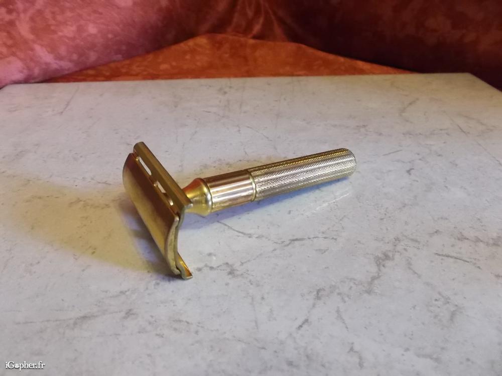 Rasoir Gillette Tone Tech Gold (AB). Il est d'occasion, en bon état. Inscription sur le rasoir : Reg Us Pat Off Made in Usa. Il est en 3 éléments. Longueur du rasoir 8.3 cm. Poids 48 grammes.