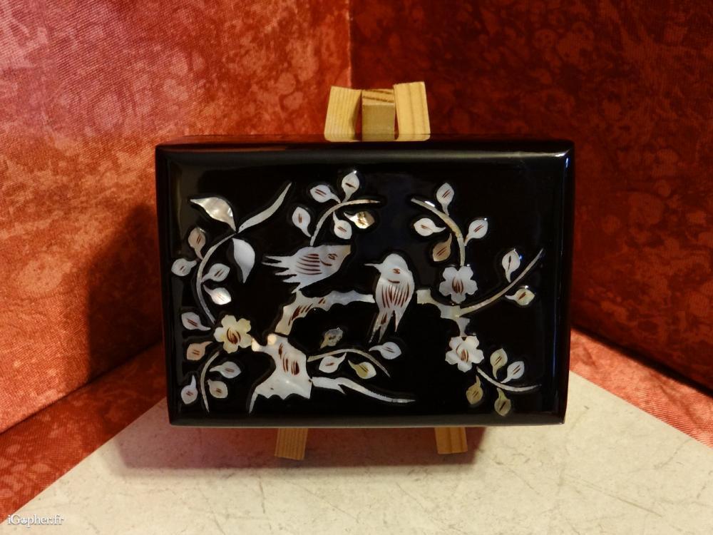 Elle est noire et nacre, dotée d'un miroir à l'intérieur et d'une protection en velours rouge. Elle est en bois de couleur noire avec comme motif des oiseaux sur une branche.