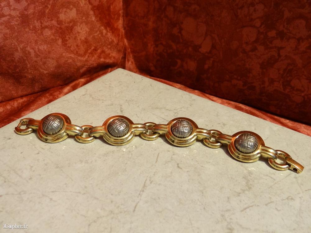 Ce bijou est d'occasion, c'est un bracelet vintage en bon état. Il est doré et décoré de boules argentés.
