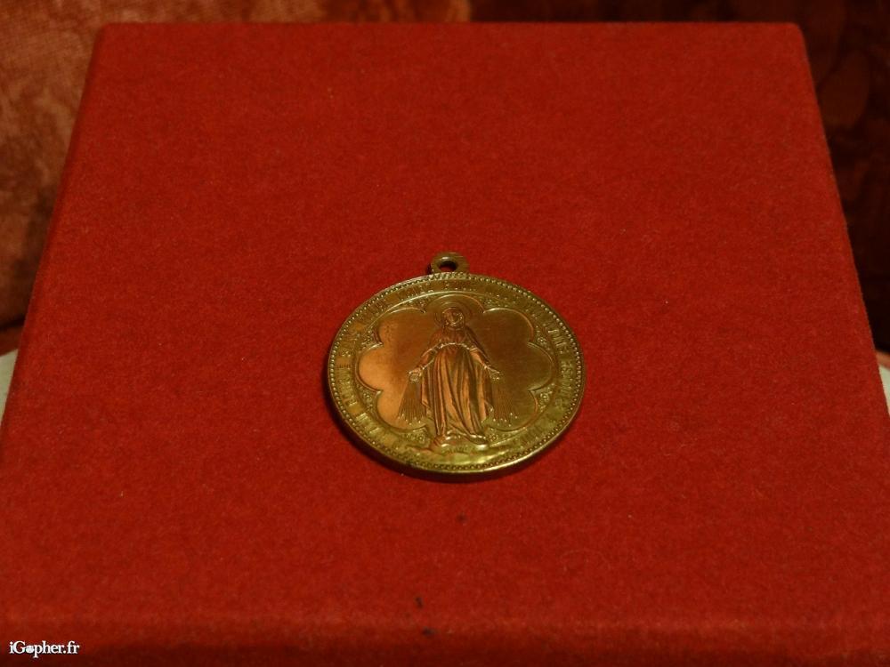 Médaille Ô Marie Souvenir de Mission. Elle est en très bon état. Inscription au recto : Ô marie conçue sans pêché, priez pour nous qui avons recours à vous. Penin France Poncet. Inscription au verso : souvenir de mission. Diamètre : 32 mm. Poids : 12 grammes.