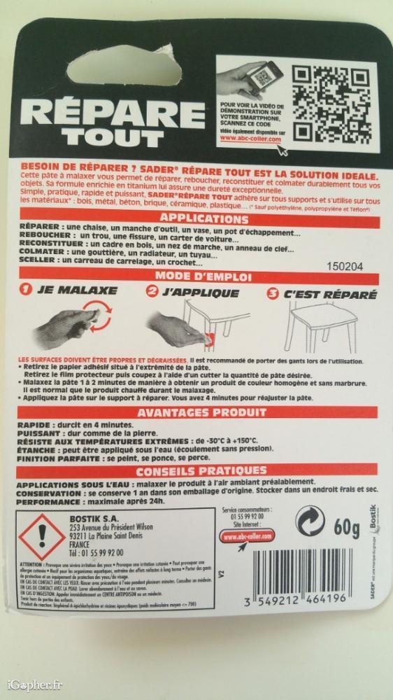 Une pâte à réparer, multi-usages, RÉPARE TOUT SADER, contenant 60 grammes.