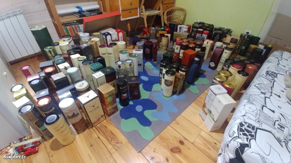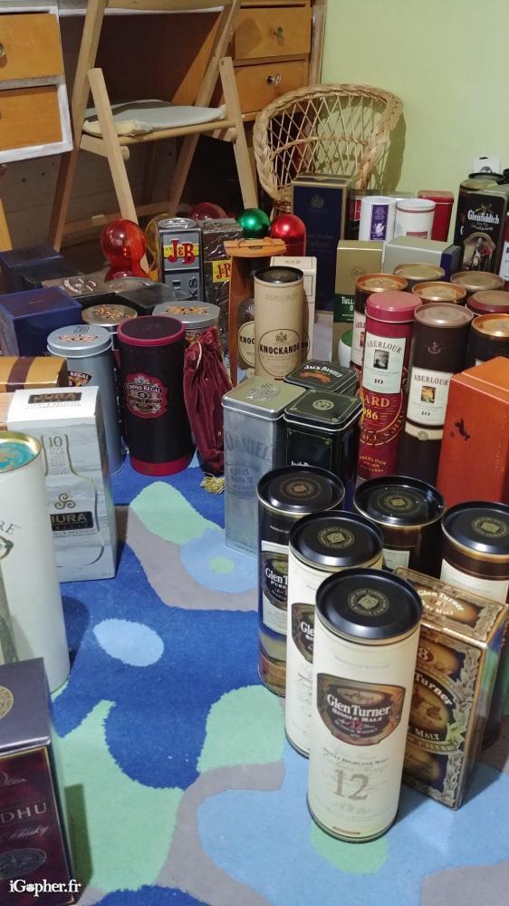 Lot de 160 boites à whisky (Glenfiddich, Clan Cambpell, J. Walker, Paddy, Tullamore, JB, Aberlour, Chivas, Ballentine's, Glen Ord, Glen Livet, Isle of Jura, Balvenie, Glen Turner, Macallan, Oban, Bushmill's, Knockando, J. Daniel's, Grant's, Bowmore, Talister, Glen Morangie...).