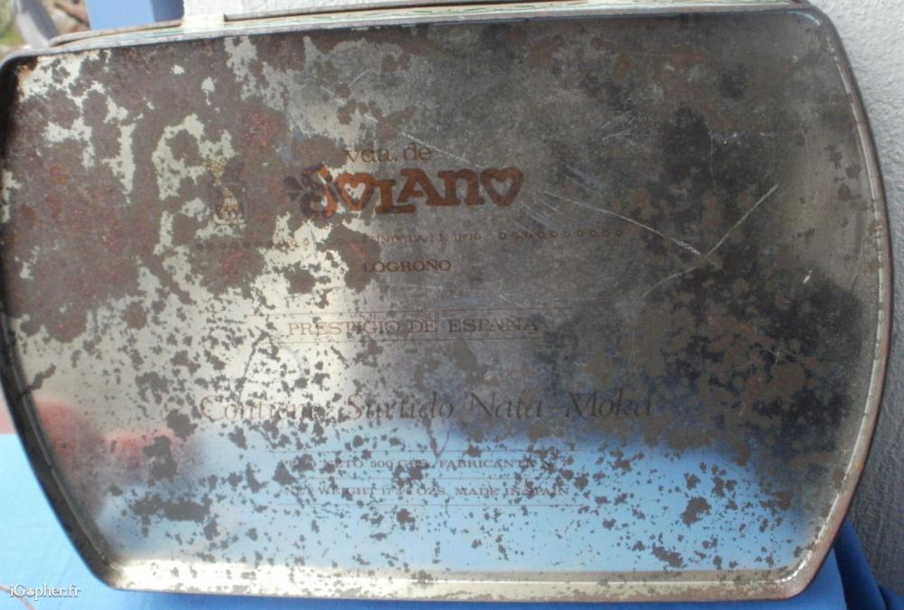 Une ancienne boite en métal, "Vda de SOLANO", qui contenait autrefois des "Sortido Nata-Moka" (un un assortiment de friandises avec de la crème moka).