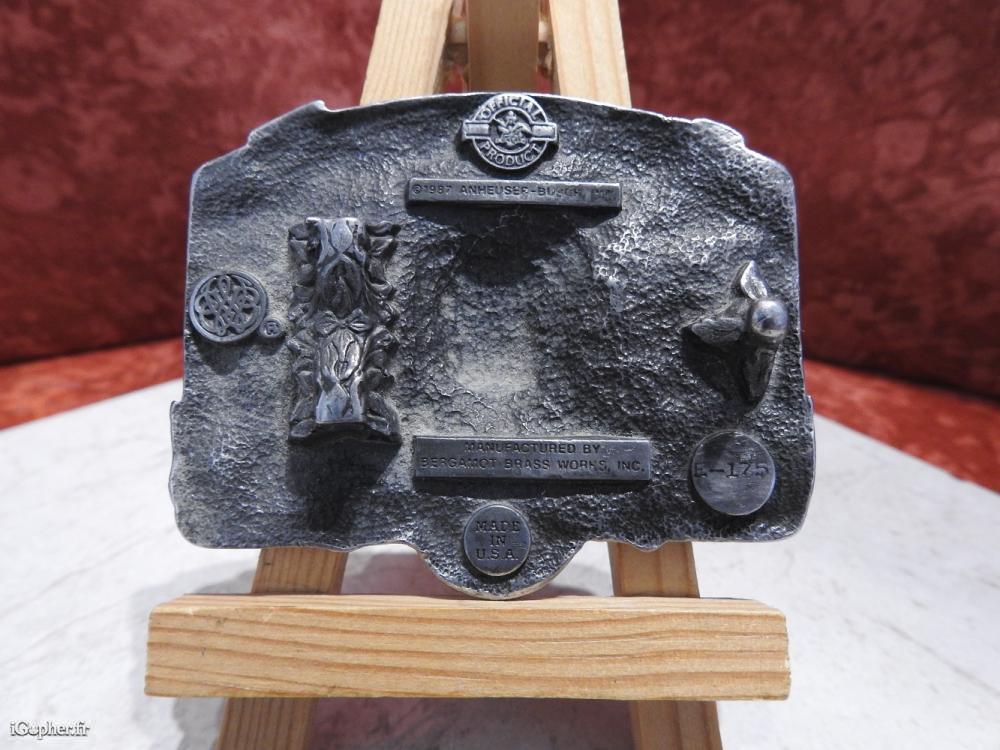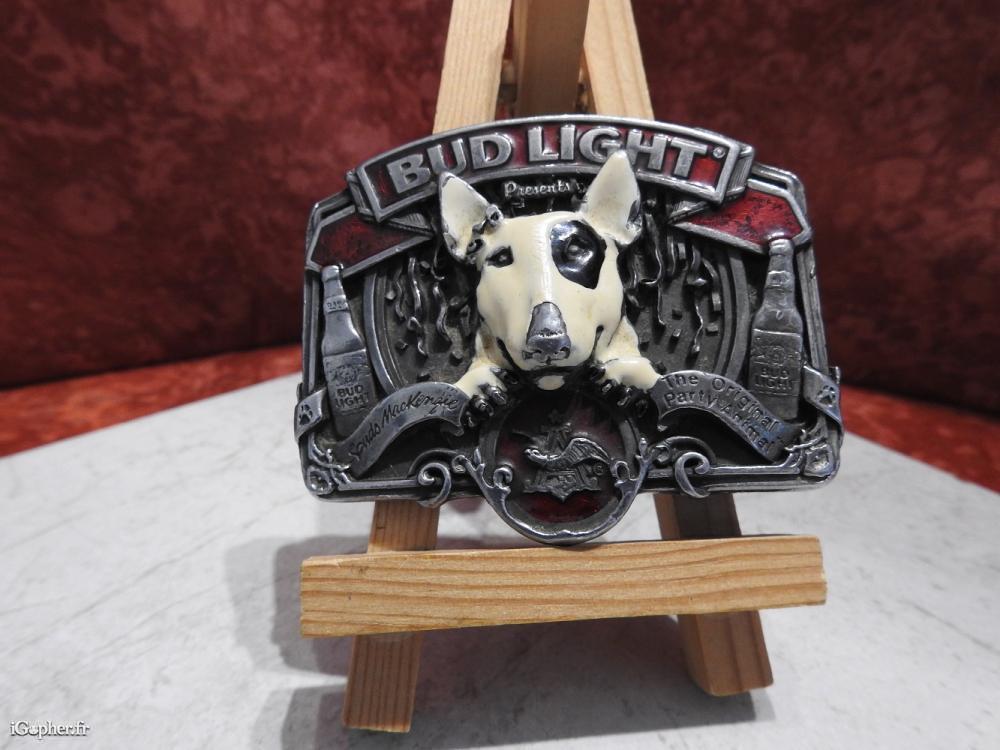 Boucle de ceinture MacKenzie Bud Light. Elle est destinée à la collection, ayant une fixation qui s'est cassé, voir 3ème photo. Elle est en laiton vieilli de Bergamot Brass Works avec patates MacKenzie, la célèbre mascotte de Budweiser. Made in U.S.A. Fabriquée par bergamote laiton Works Inc. Produit officiel de Anheuser-Busch Inc. C. 1987.
