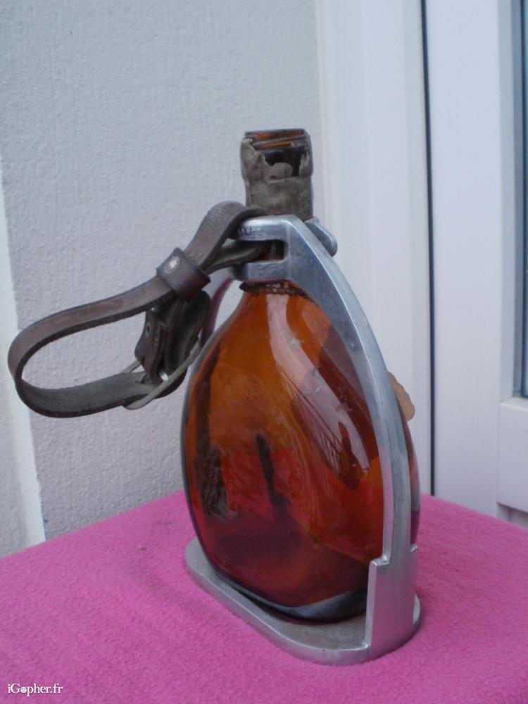 Une bouteille Armagnac Ducastaing, vide, dans un étrier.