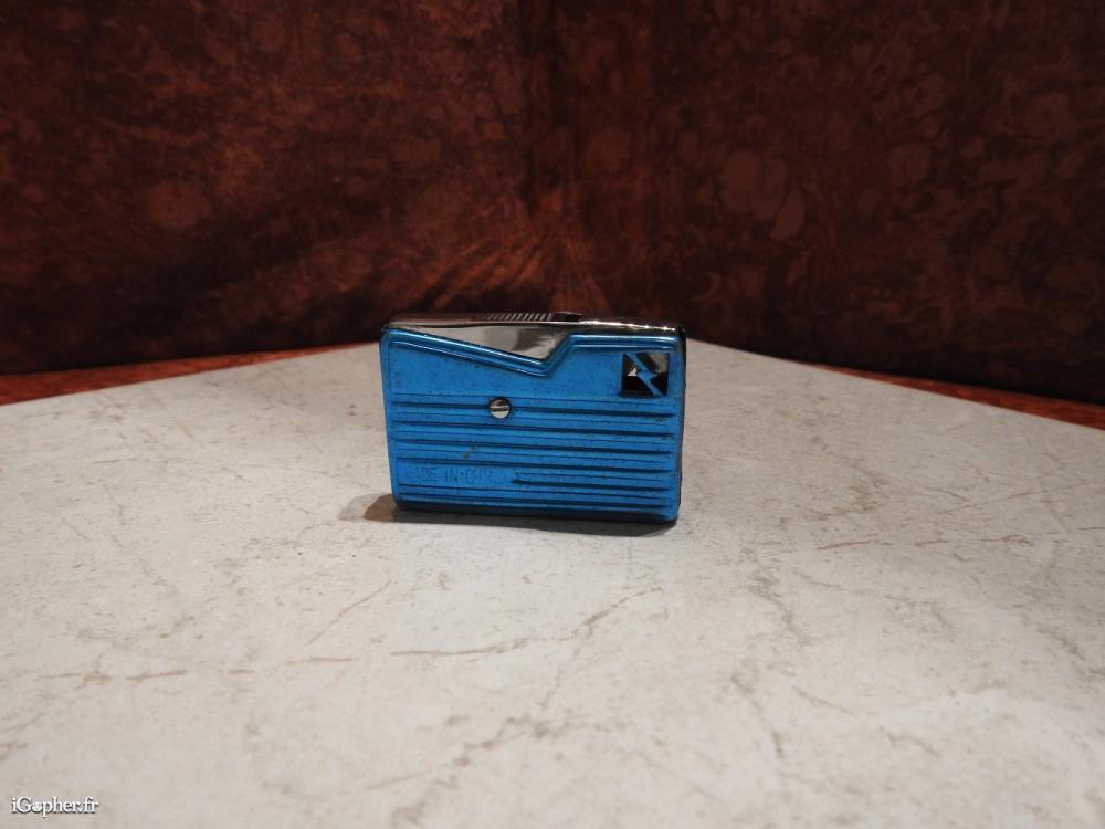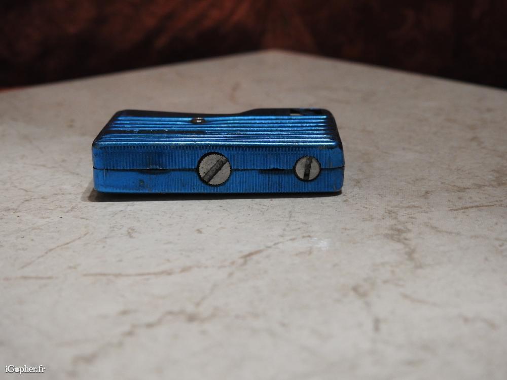 Briquet radio bleu. Il est d'occasion, en métal et aluminium. Fonctionne avec de l'essence. Destiné à la collection. Longueur 5 cm. Hauteur 3.5 cm. Épaisseur 8 mm. Poids vide 31 grammes.