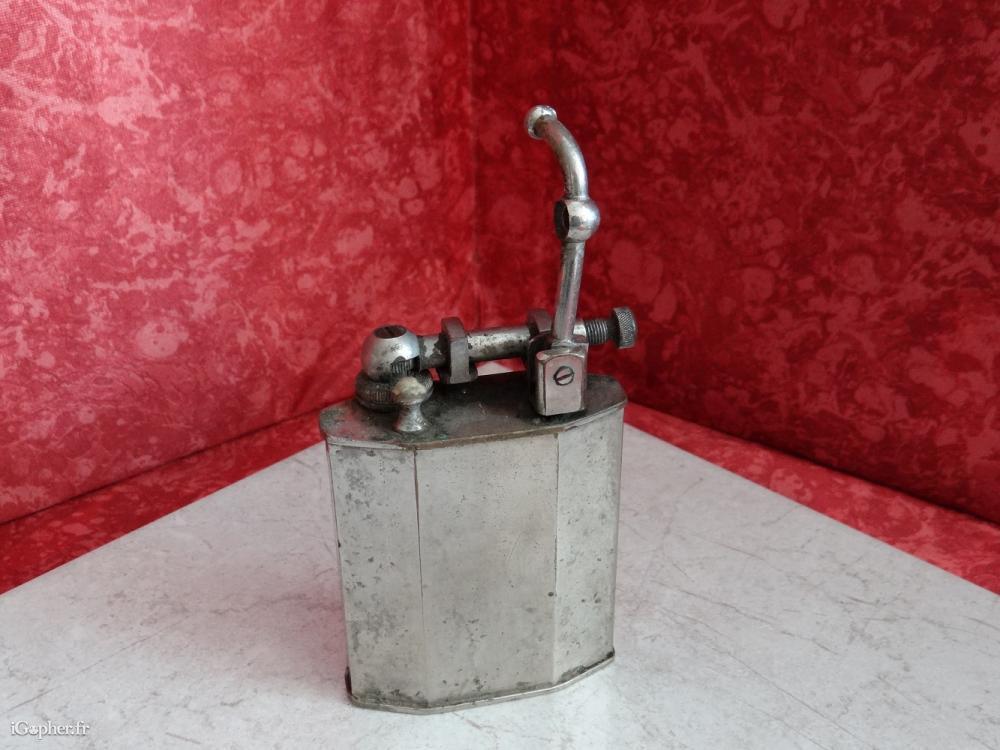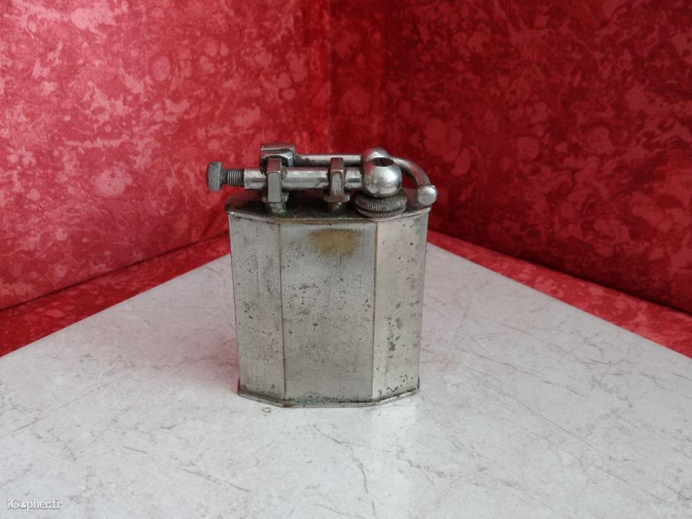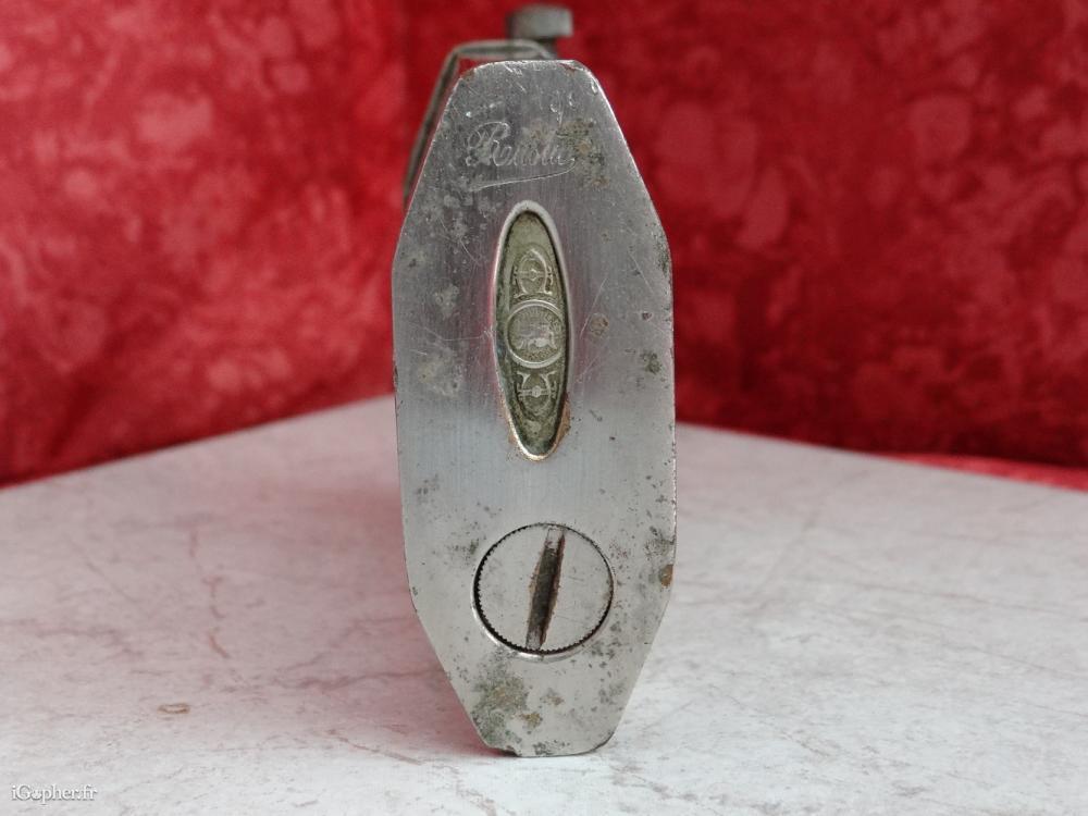 Un briquet de table Rustic, il est ancien, mis en vente dans son jus. C'est un briquet doté d'une plaque de taxe. Il est en laiton chromé.