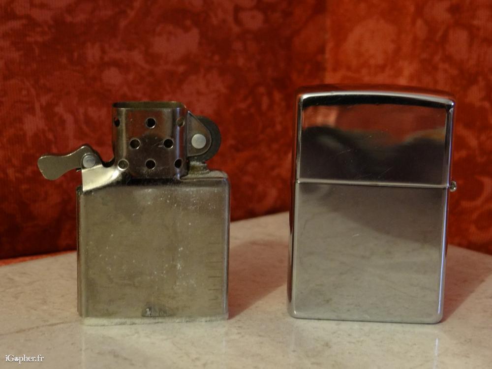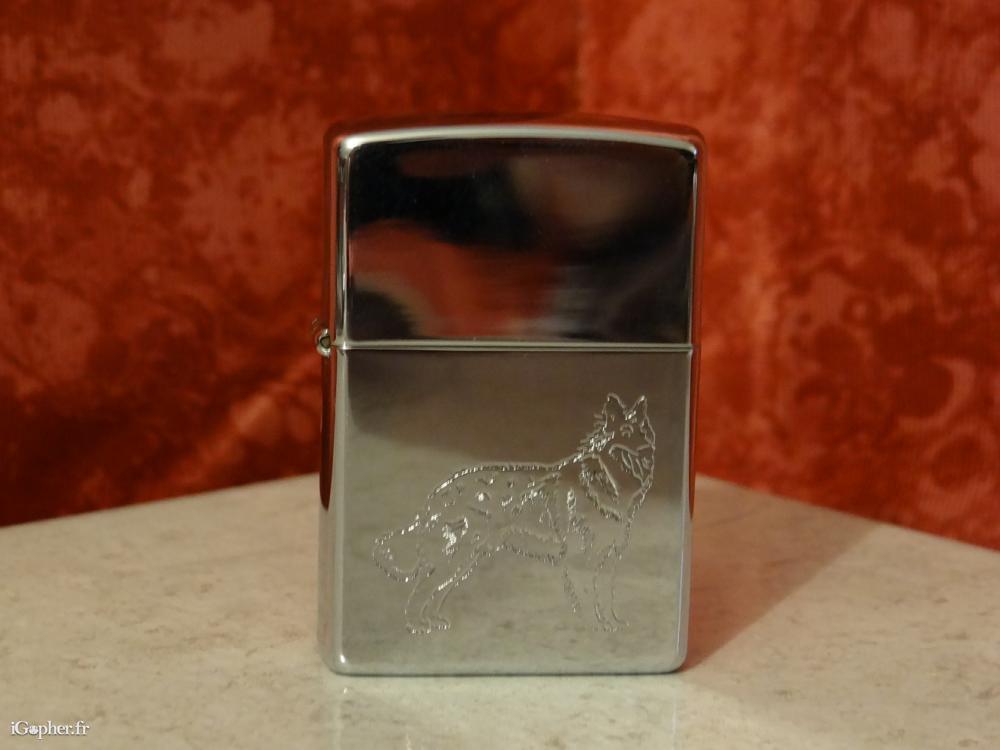 C'est un briquet Zippo d'occasion mais en très bon état, Zippo X-V. Il est décoré d'une gravure d'un chien Berger Allemand.