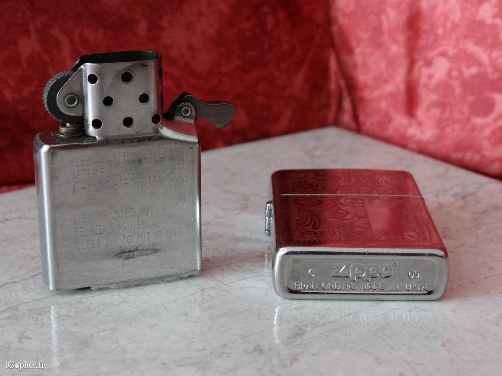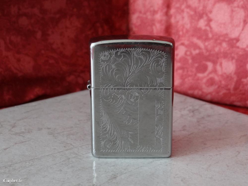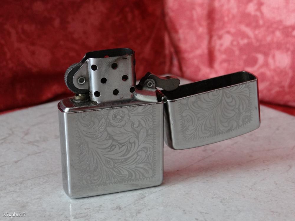 Un briquet d'occasion mais en bon état physique et de fonctionnement. C'est un briquet tempête Zippo en métal chromé ciselé, il fonctionne à l'essence.
