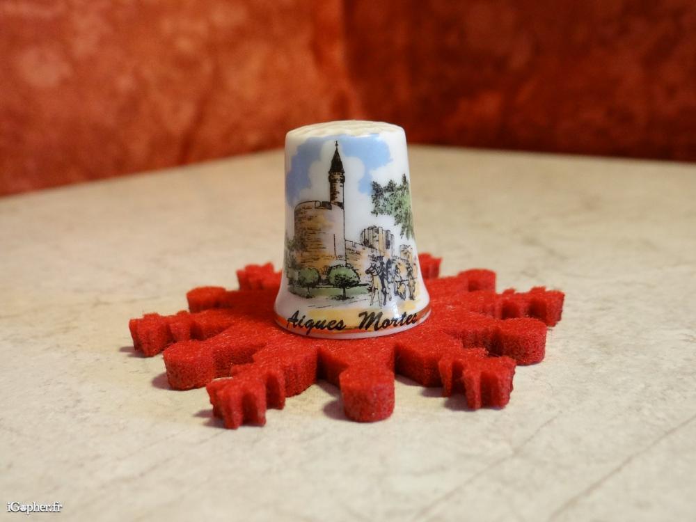 Dé à coudre de collection. Aigues-Mortes Tour de Costance. Il est en bon état. Matière : céramique, voir porcelaine. Origine : Aigues-Mortes, en occitan Aigas-Mòrtas, est une commune française située dans le département du Gard en région Languedoc-Roussillon.