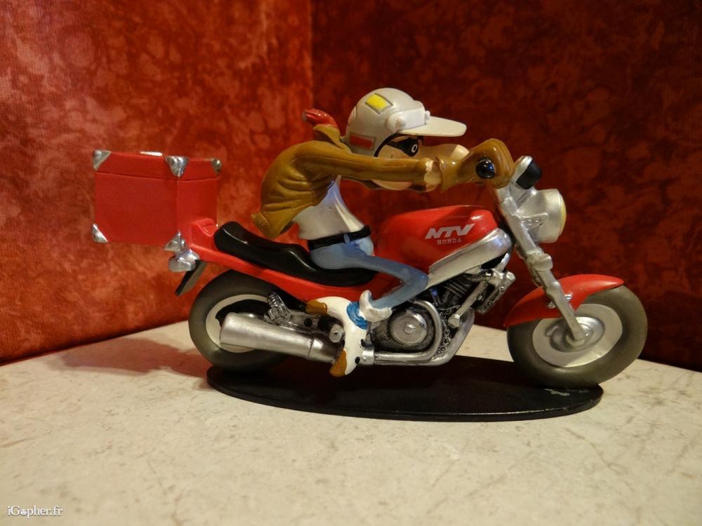 Une figurine de collection qui représente Raoul Mapoule, la Joe Bar Team, sur sa moto, une Honda 650 NTV.