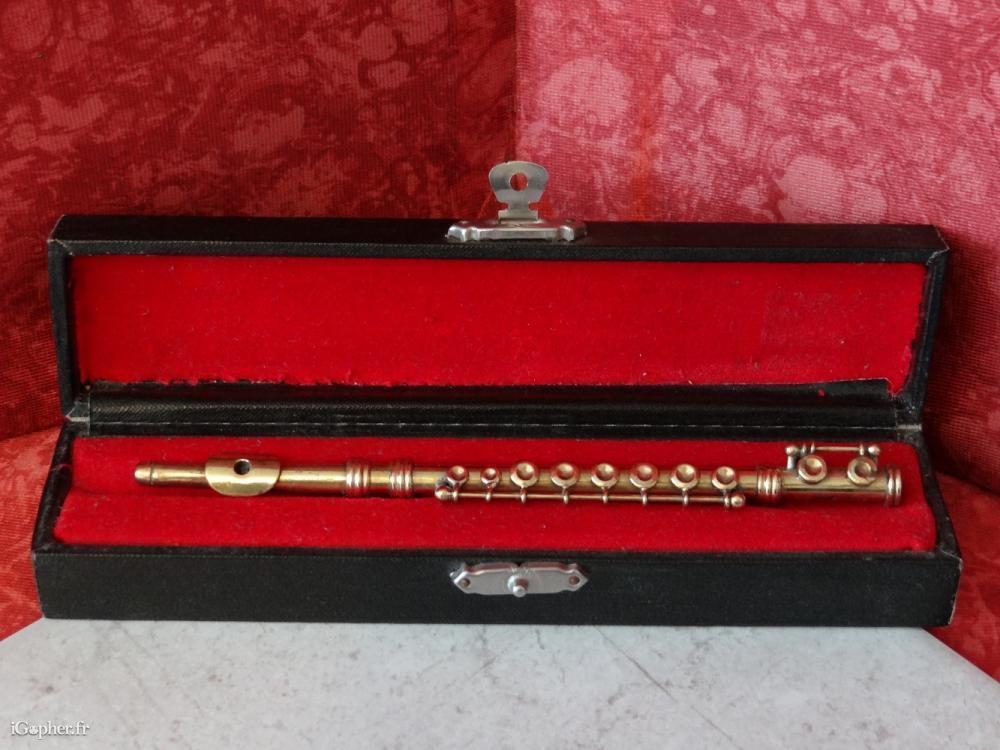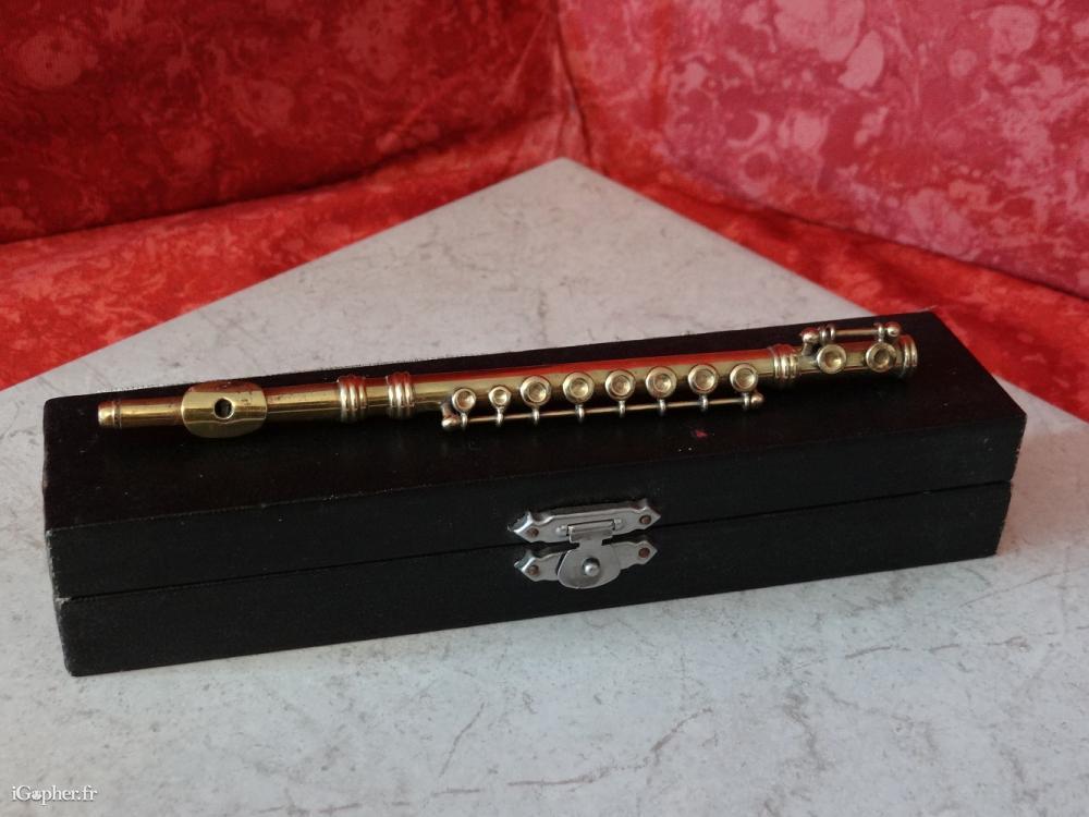 Une petite flûte traversière, elle est destinée à la collection ou la décoration. C'est un article d'occasion mais en bon état. Elle est en métal doré, avec sa boite de rangement.