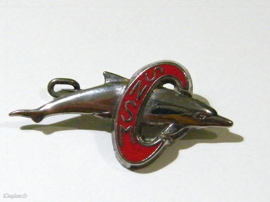 Un insigne avec un dauphin du SNSM : Les Sauveteurs en Mer.
