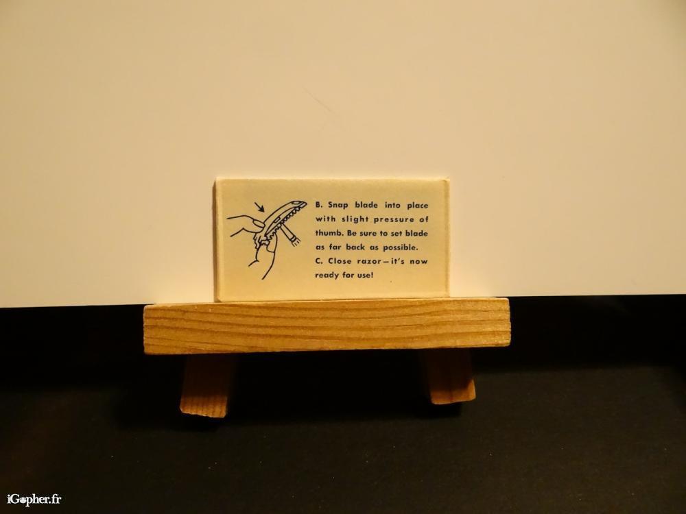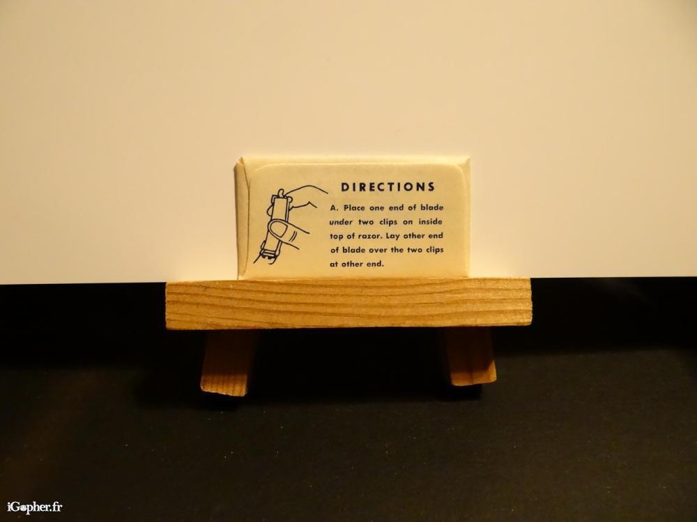 Dans son emballage d'origine non ouvert. Inscription sur l'emballage : B. Snap blade into place with slight pressure of thumb. Be sure ta set blade as for back as possible. C. Close razor - it's new ready for use !