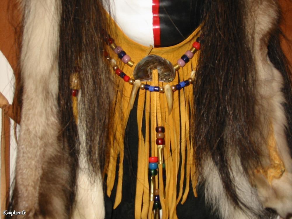 Pour la création de ses oeuvres Grey Wolf n'a utilisé que les matières traditionelles : cuir, poils, fourrure, plumes, coquilles, perles, griffes, broderie...