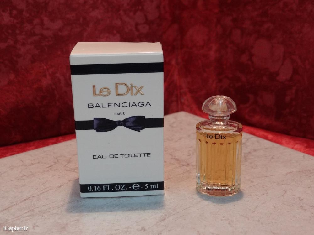 Un parfum miniature contenant l'eau de toilette "Le Dix" de Balenciaga Paris. Le flacon comprend 5 ml, il est en vente avec sa boite.