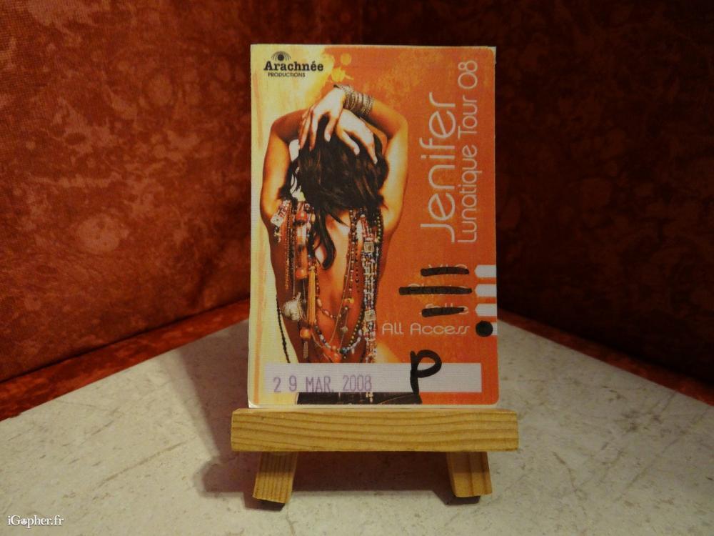 Un Pass VIP qui donnait accès au "Jenifer Lunatique Tour" en 2008, il est en tissu et maintenant destiné à la collection. Il viendra peut-être compléter votre collection ou bien il vous permettra de la commencer.