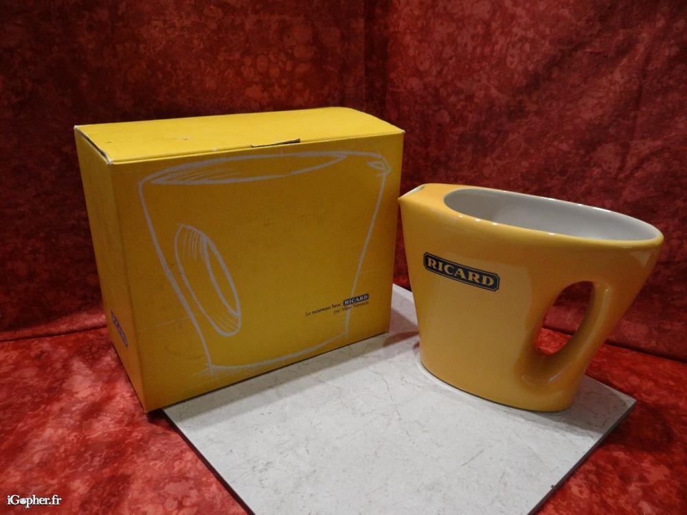 Pichet Ricard, il est en parfait état avec sa boîte d'origine. Matière, céramique jaune et blanche, made in France.