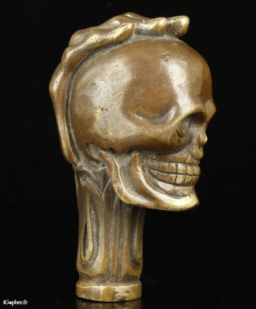 Pommeau de canne Skull (tête de mort) avec main posée.
