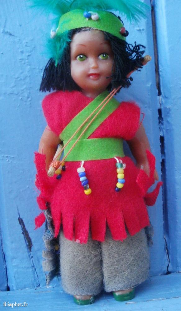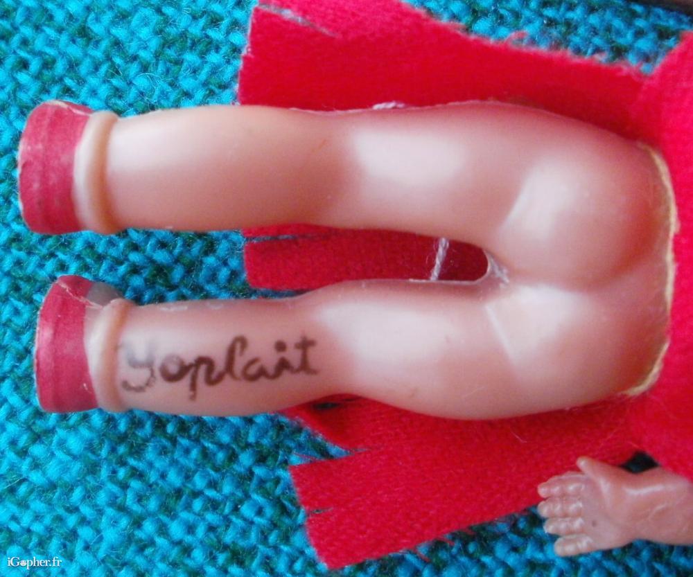 Une poupéee indienne, estampillée YOPLAIT sur le dos de la jambe droite.