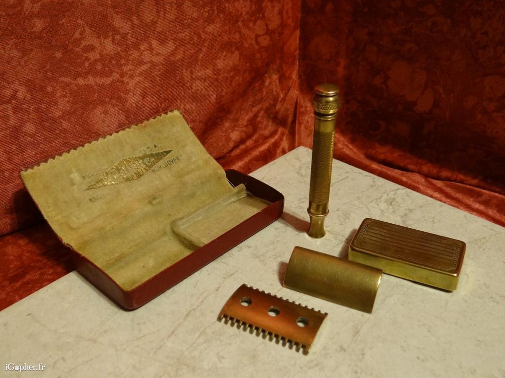 Un rasoir d'occasion de type sureté, il est ancien et en bon état. C'est un rasoir de marque Gillette, type Ball End Gold.