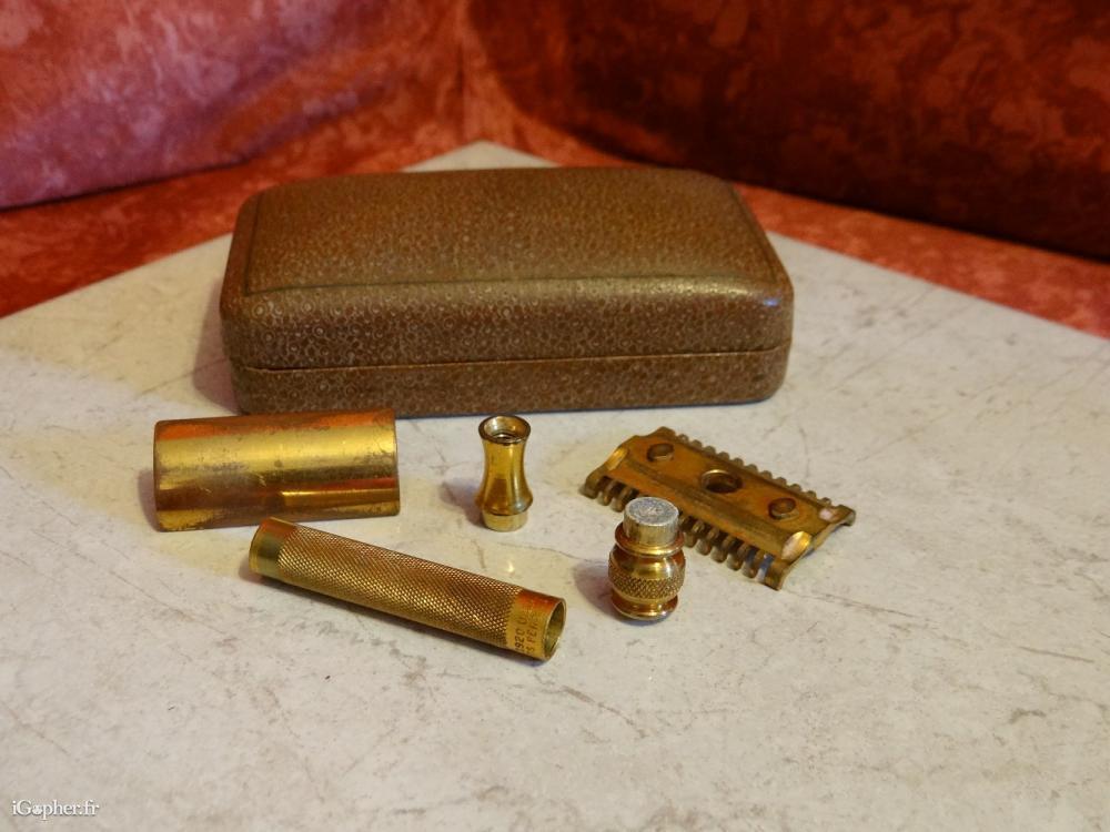 Ce rasoir est un article d'occasion mais en bon état. C'est un rasoir pour homme de la marque Gillette, modèle Gold USA, il est de type sureté et en métal doré.
