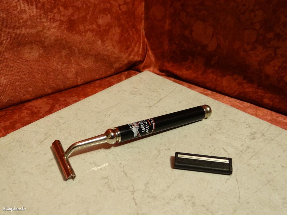 Un rasoir Harley-Davidson, il est en bon état et utilise des lames communes que l'on trouve en grande surface. Il est en métal de couleur noir.