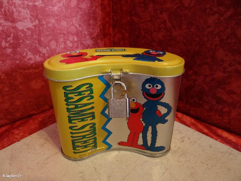Une tirelire "Sesame Street" avec son cadenas et ses deux clés. cette "Money Box" est un article neuf, en métal.