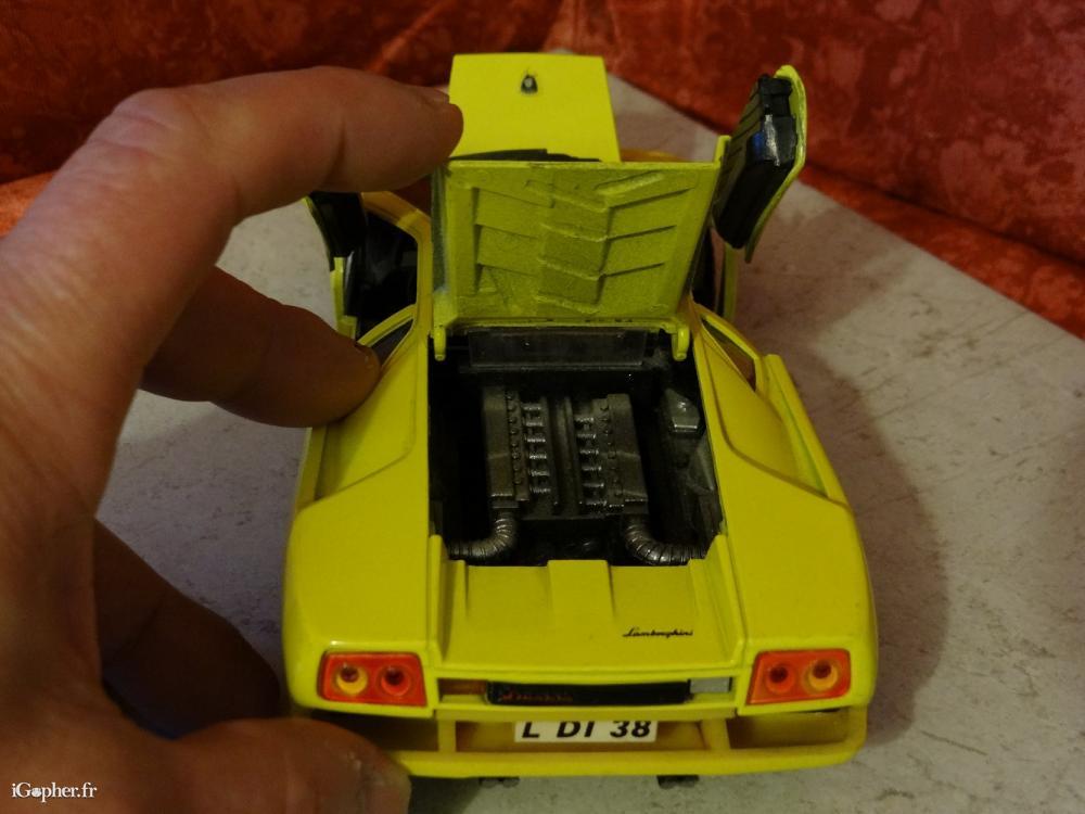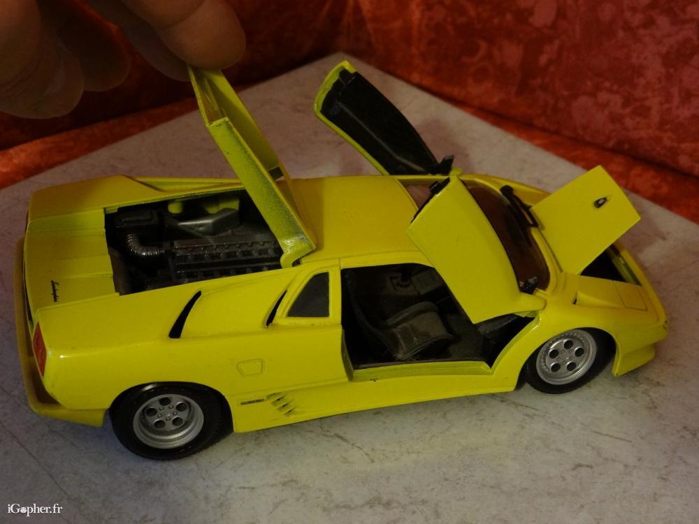 Une voiture miniature d'occasion, mais en bon état. C'est une Lamborghini Diablo de couleur jaune, réduite à l'échelle 1/24.