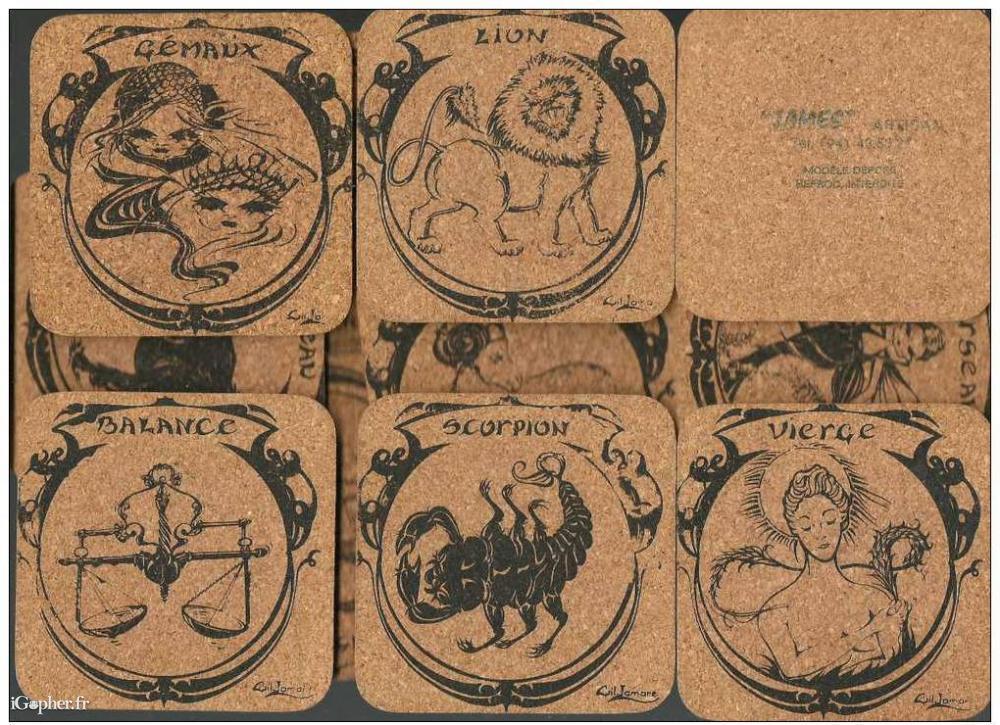 Un lot de douze dessous de verre, en liège. Chacun représente un signe du zodiaque différent.