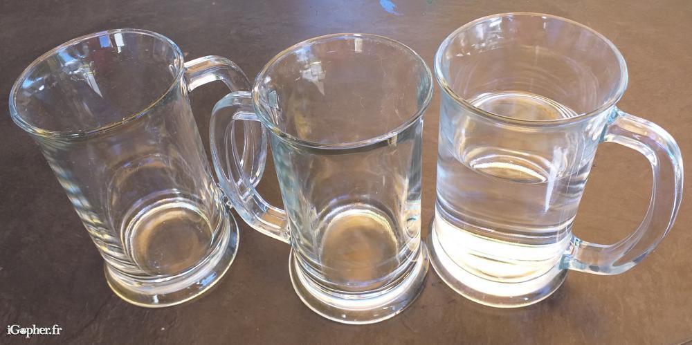 Une des chope a été remplie d'eau, à hauteur de 25 cl, il reste de la marge pour aller jusqu'au 39.5 cl.