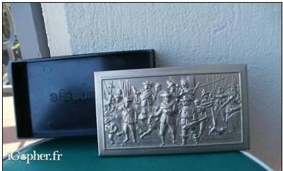 La partie basse est en plastique. La partie haute est en métal et représente une scène de l'Histoire, une scène de bataille en relief.