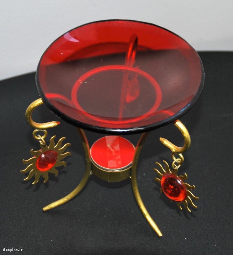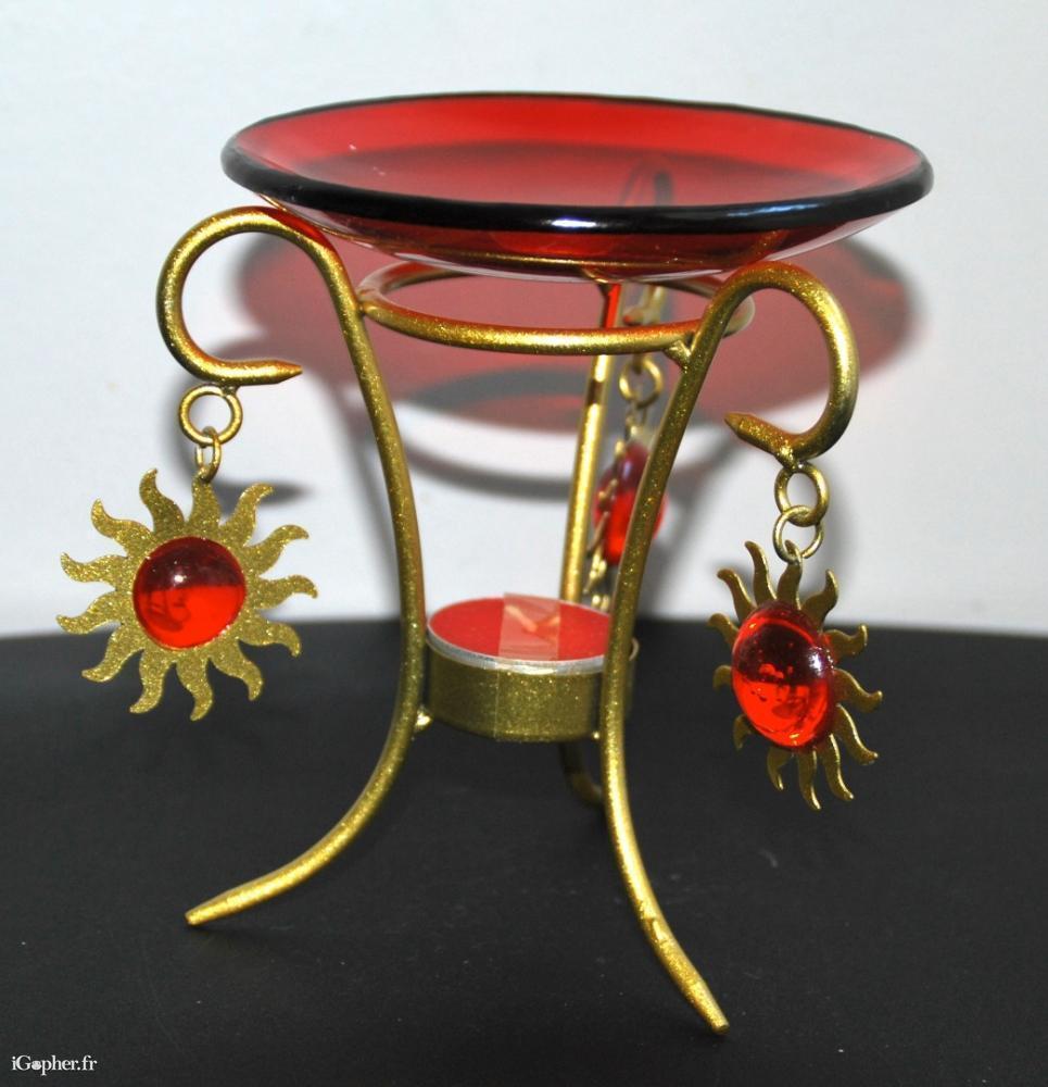Un joli brûle parfum, il est en parfait état (neuf) avec une coupelle en verre fumé rouge, le pied est en métal doré. Il est décoré de trois soleils suspendus.