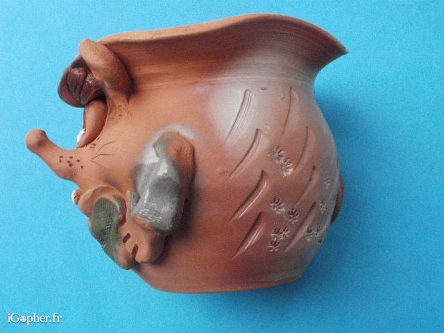 C'est une poterie du Tarn et Garonne (vers Bruniquel), un cache pot pour les plantes qui peut également servir de vide poche, cache pot, pot à crayons etc. Il est décoré d'une tête de souris rigolote avec un noeud papillon.