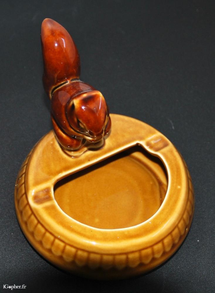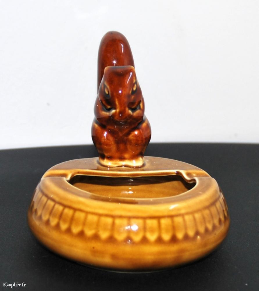 Un cendrier qui peut également servir de vide-poches. Il est décoré d'un écureuil. Il est entièrement marron, je ne connais pas la matière mais cela ressemble à de la porcelaine.