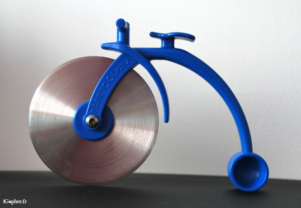 Un coupe pizza originale et insolite car il a la forme d'un vélo de type Grand Bi. Il est en platique bleu. La roue de devant est une lame coupante.