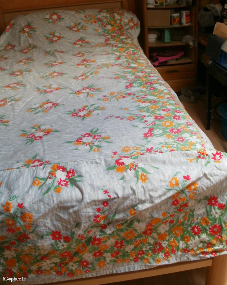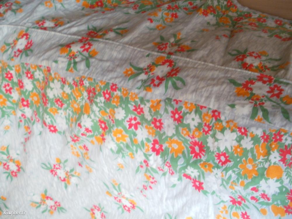 Un dessus de lit vintage en bon état, pour un lit d'une personne (140 cm). Un volant retombe sur chaque côté.