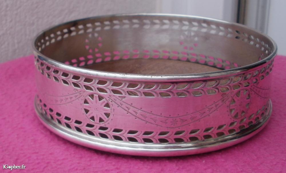 Dessous de bouteille de vin en métal argenté ou plaqué argent. Etiquette au-dessous. Seull le contour est en métal argenté.