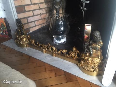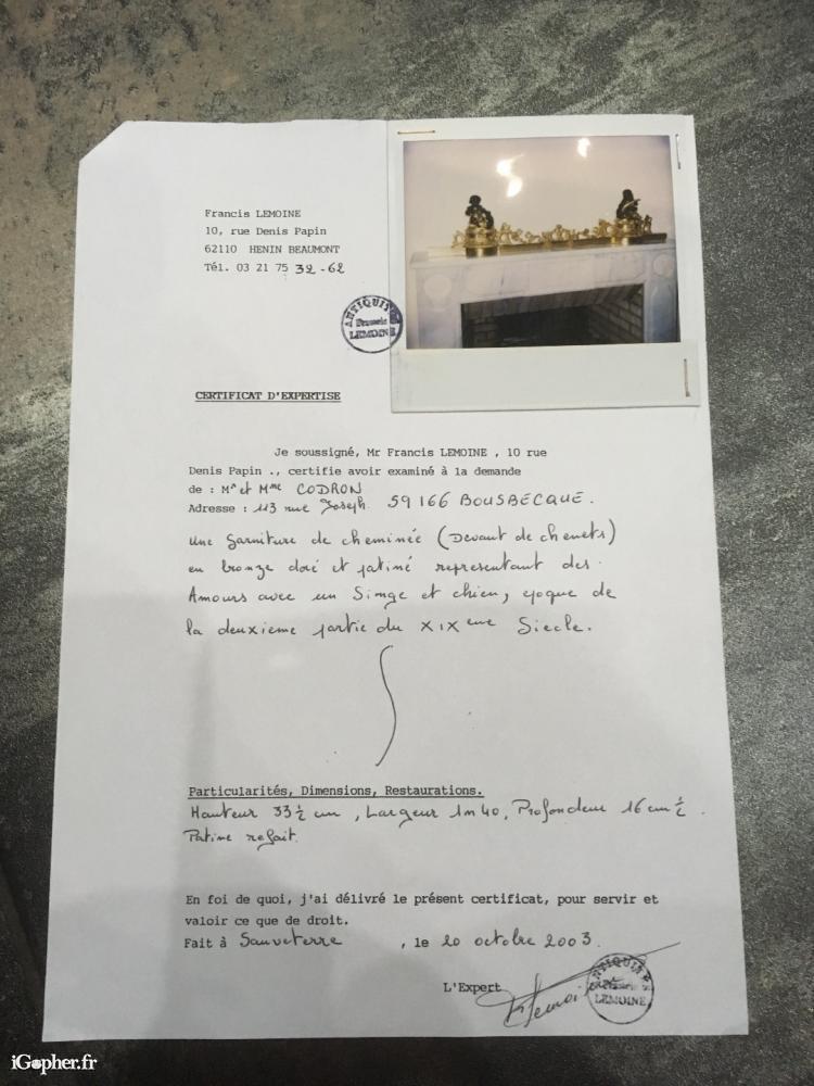 Garniture de cheminée en bronze doré et patiné représentant des Amours avec un singe et chien. Époque de la deuxième partie du XIXe siècle. Avec Certificat d'expertise. Prix d'achat 3500 €.