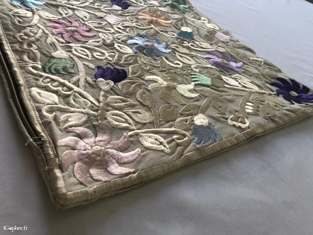 Une housse de coussin marocaine délicatement brodée de tissu pure soie marocain sur une fine en coton dans le style traditionnel classique rbati après la capitale de rabat.