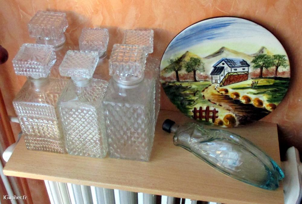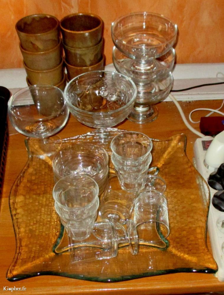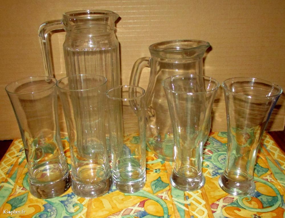 Un lot comprenant des carafes, des pichets, des verres, des tasses, des objets de décorations. Le tout est à vendre pour 20 €.