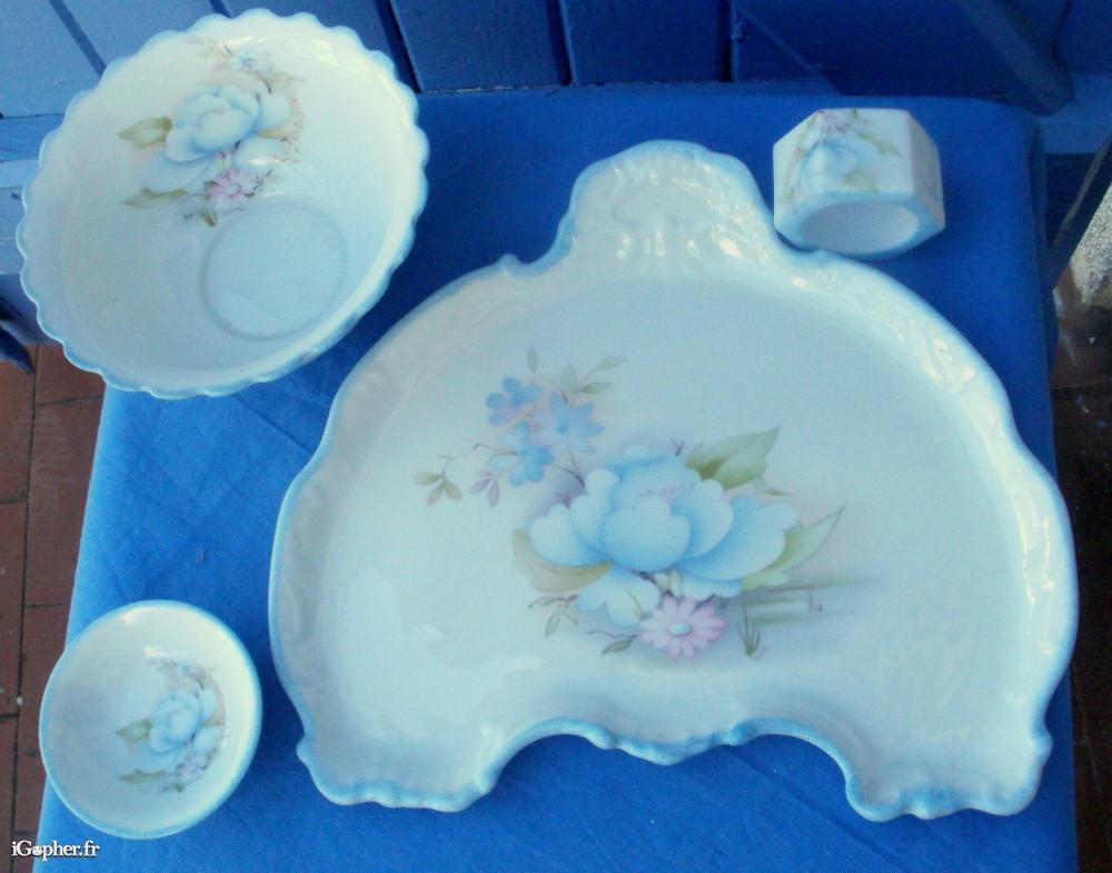 Ensemble en porcelaine original, porcelaine de Limoges astampillé "Ateliers MILLAS" au dessous de l'assiette. Décor floral.