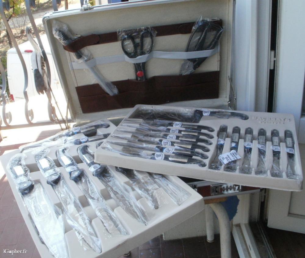Chaque ustensile se trouve dans son emballage individuel d'origine.La mallette est marron acajou, avec un code.Visible à Montauban.