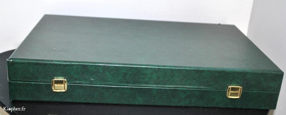 Une ménagère ancienne (une valise verte) qui contient des couverts en métal argenté. Des poinçons sont apparents mais ce n'est pas de l'argent.