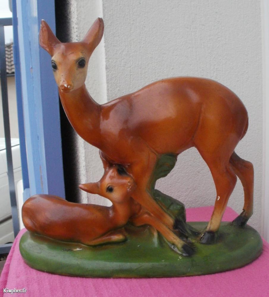 Un objet décoratif représentant une biche et son petit faon en plâtre.