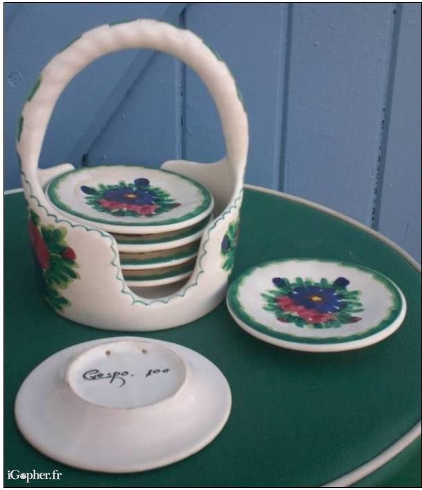 Un panier et ses six assiettes en faïence (ou porcelaine). Chaque article est un modèle miniature signé.